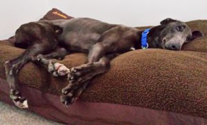 Hi all, just dropping you a line to let you know how Blue is going. He is a really happy, confident dog who has slotted into life with our family seamlessly. He is so well behaved we can’t believe it. He loves sleeping, rummaging in his toy box, watching our koi carp, walking to the beach and following us around the house. He especially loves his new bed as you can see in the photo attached. We are all besotted with him. Thank you once again for organising our adoption of Blue he has transformed our lives.
